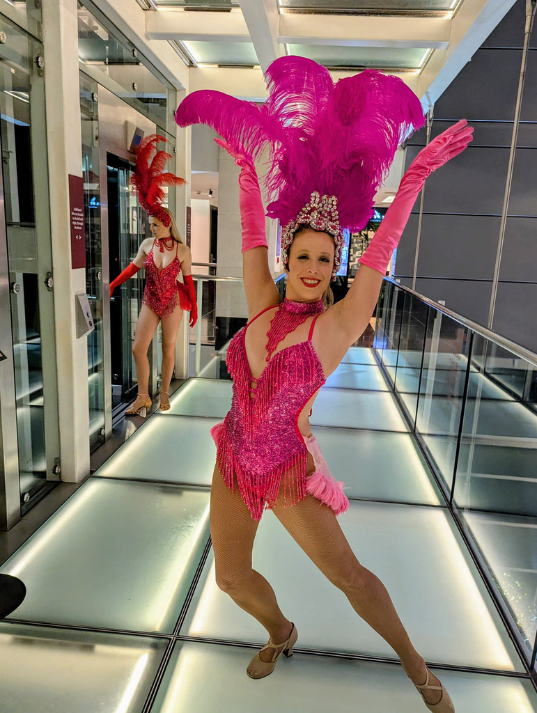 - Large magenta-coloured backpack with plumes of ostrich feathers and a showgirl costume